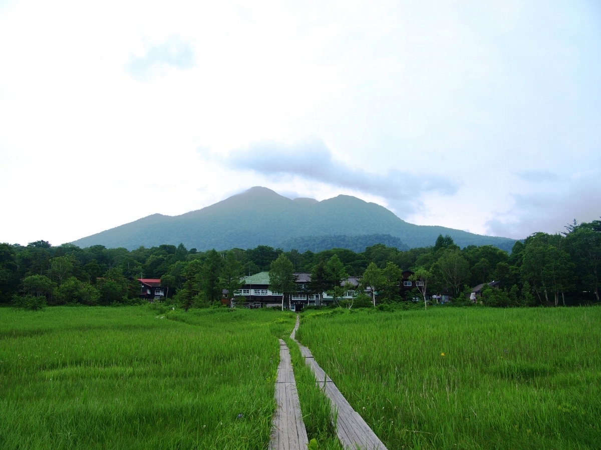 燧ケ岳を正面に、雨に濡れてしっとりとした緑色の草原の中、緩やかな曲線を描いて抜けていく木道。