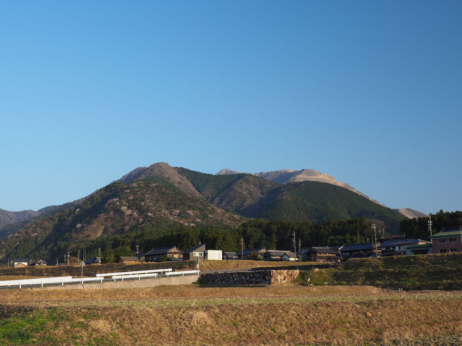 青川の向こうに竜ヶ岳と藤原岳を結ぶ県境尾根が見える。